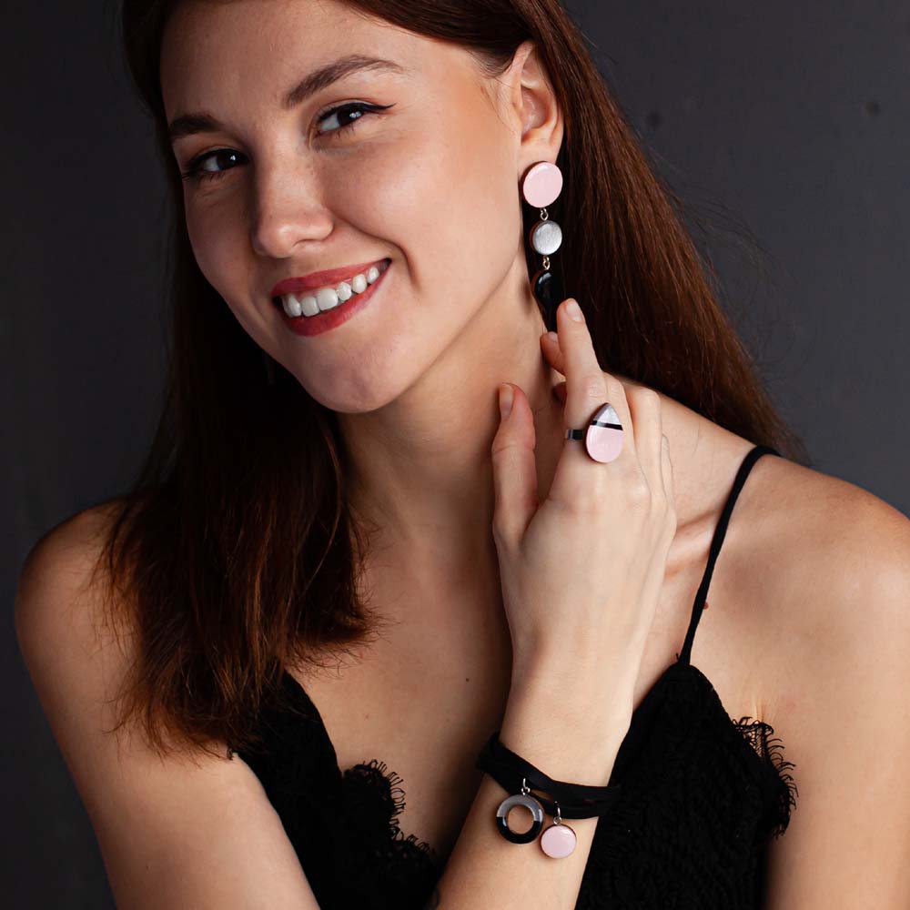 выполненных из дерева, ювелирной смолы и гипоаллергенной хирургической стали (фурнитура).